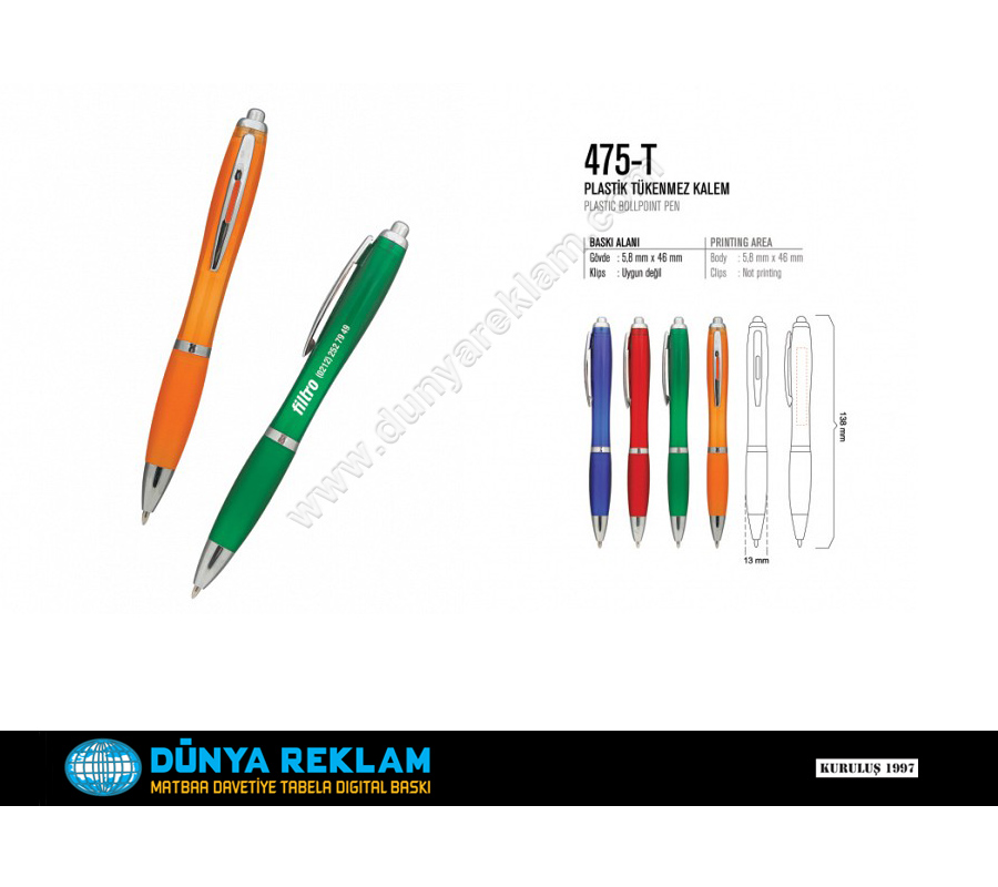 Nisan 15, 2026 475-T Resimi büyütmek için üzerine tıklayınız. Ürün Adı : Plastik Kalemler Ürün Kodu: 475-T 1000 Adet Fiyatı: – Baskı Şekli : Çift Taraf Baskılı Özellikleri : Ürünümüz 1. Kalite olup TSE Kalite Güvencesindedir.
